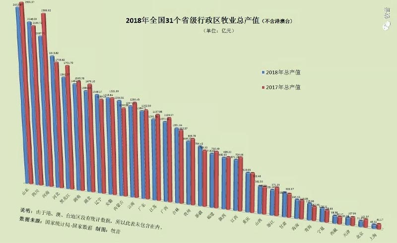 数据显示,2018年我国牧业总产值较2017年减少663.78亿元,同比减少2.26%。其中有12省(区)牧业总产值实现增长,分别是四川、河北、辽宁、吉林、内蒙古、新疆、山西、甘肃、海南、青海、宁夏和西藏,其他19个省(区、直辖市)均下降。其中,增幅最大的为青海省(18.03%),其次是宁夏(13.12%)和内蒙古(7.81%)。其中降幅最大的是北京(29%),其次是上海(21.65%)和河南(12.72%)。